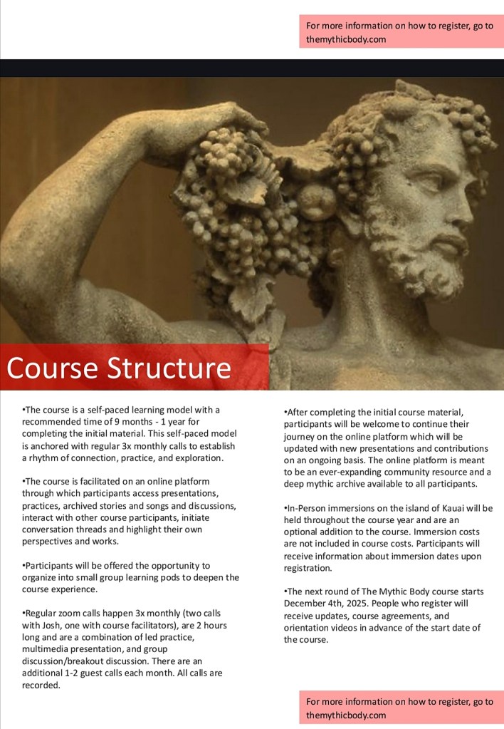 I’m excited to share that the next round of The Mythic Body course by Josh Schrei of The Emerald Podcast has just been released, with some key changes that will allow for more folks to join and to provide communal continuity beyond the initial year-long format that it’s had these last 4 years.
